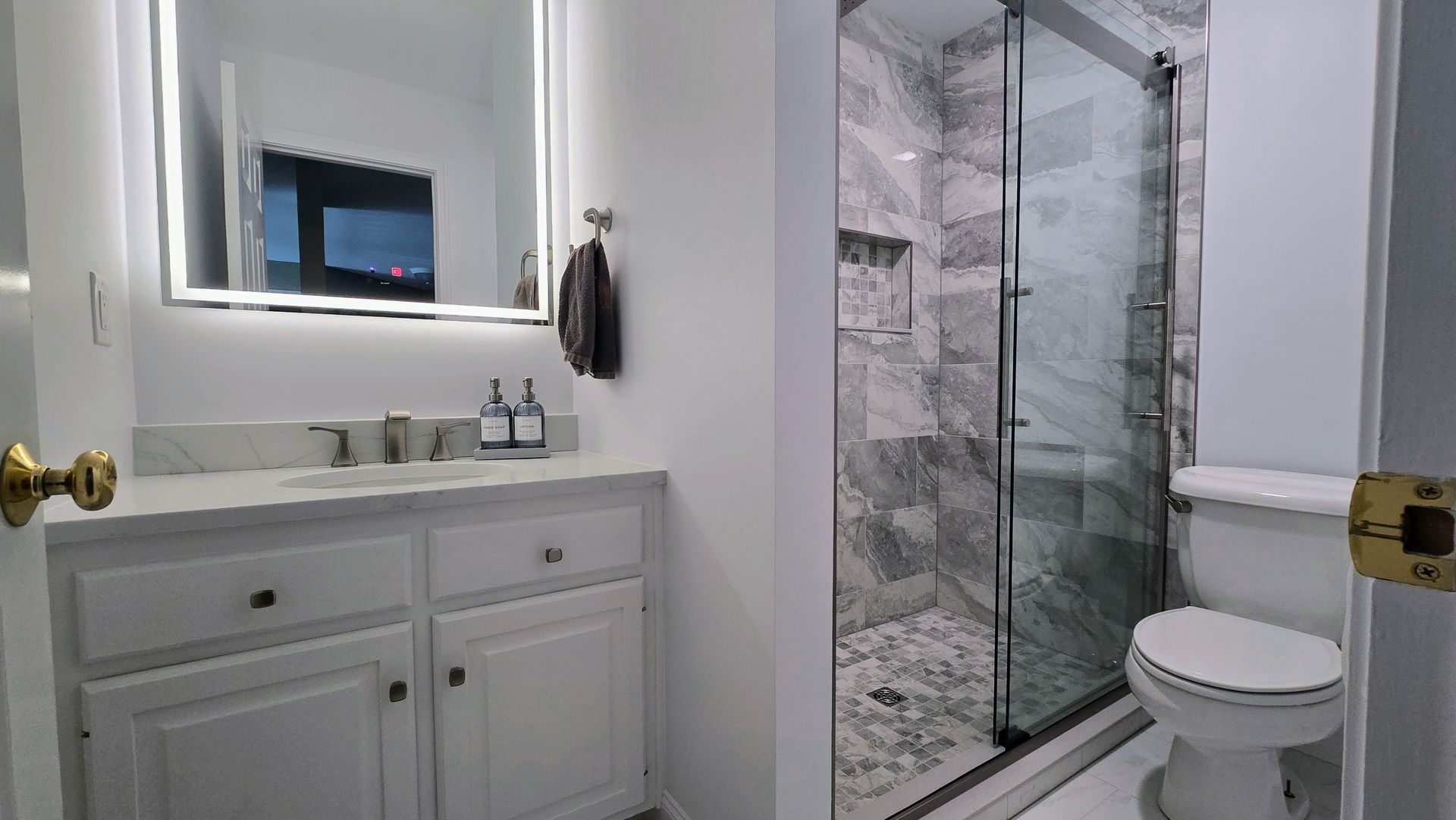 The vanity area is now a centerpiece of style and functionality. The homeowners opted for a white shaker-style vanity cabinet that brings a classic yet updated look, complete with ample storage for toiletries and towels. Its sleek white countertop (crafted from a durable quartz) offers plenty of surface space and contrasts beautifully with the soft gray tones of the floor and wall tiles. Above the vanity, the new LED backlit mirror not only adds a modern flair but also improves the lighting dramatically – no more dark corners or unflattering shadows. This mirror, along with an updated overhead light, bathes the room in a bright but gentle glow. The combination of the illuminated mirror and fresh light fixtures means the bathroom is as practical for daily routines as it is striking in appearance.